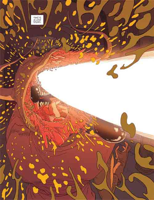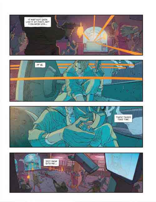 “On scope alone, this is one of the biggest projects I’ve illustrated,” continues co-creator and artist Amilcar Pinna. “Shifting from massive spreads of space fleets and black holes—perfect for DSTLRY’s oversized format—to staccato gunfights in celestial dive bars, Galactic is sci-fi at its most dynamic and challenging.”