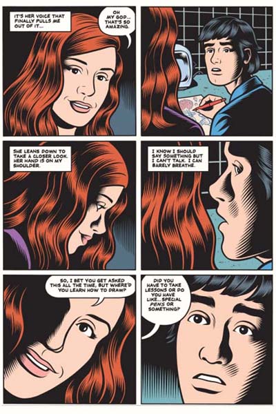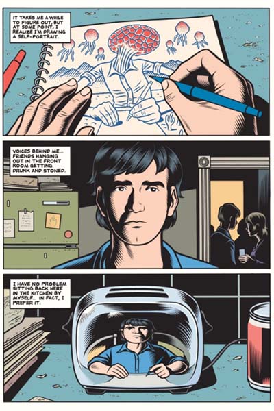 A mutual passion for movie making has been a constant for Brian Milner and Jimmy Walker since they became friends in junior high. Now some years later and with several amateur movies to their credit, Brian and Jimmy are about to embark on their most ambitious project yet. The night of Jimmy’s birthday party Brian sits alone in the kitchen. With sketchbook in hand, Brian’s distorted reflection in a chrome toaster propels him into an imaginary world where he is transformed into a giant alien form floating above the landscape. Brian’s fantastical reverie is interrupted by the appearance of the inquisitive and charming Laurie, a new acquaintance of Jimmy who has recruited her to be the star of their new movie. Overcoming his initial reaction to Laurie’s outsider group status, Brian will quickly come to think of her as his muse and a possible girlfriend. Just as life will throw surprises one’s way, so too does Burns in Final Cut his latest graphic novel from Pantheon. Final Cut was originally titled Dédales and published in three parts several years ago by French publisher Cornelius.