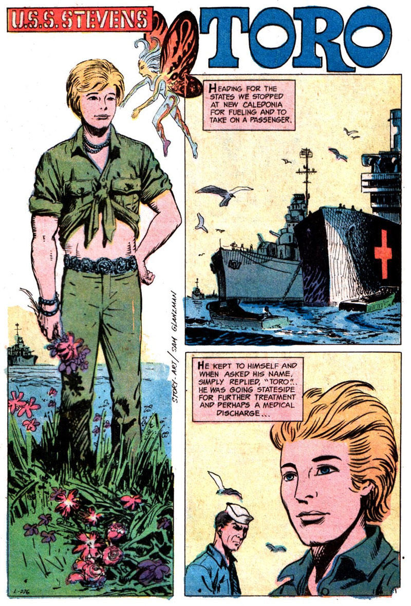 Sam Glanzman’s short story titled Toro in DC’s Our Fighting Forces #148 serendiptiously came to my attention one day during a search on Ebay for comics relating in some way to LGBT themes or representation. As I recall the seller included an image from the story that reasonably assured me purchasing the comic wouldn’t be a waste of money. Sam Glanzman wrote and drew a backup feature titled “U.S.S. Stevens” that appeared in various DC war comics based on his experiences during naval service aboard a ship of the same name during World War II.