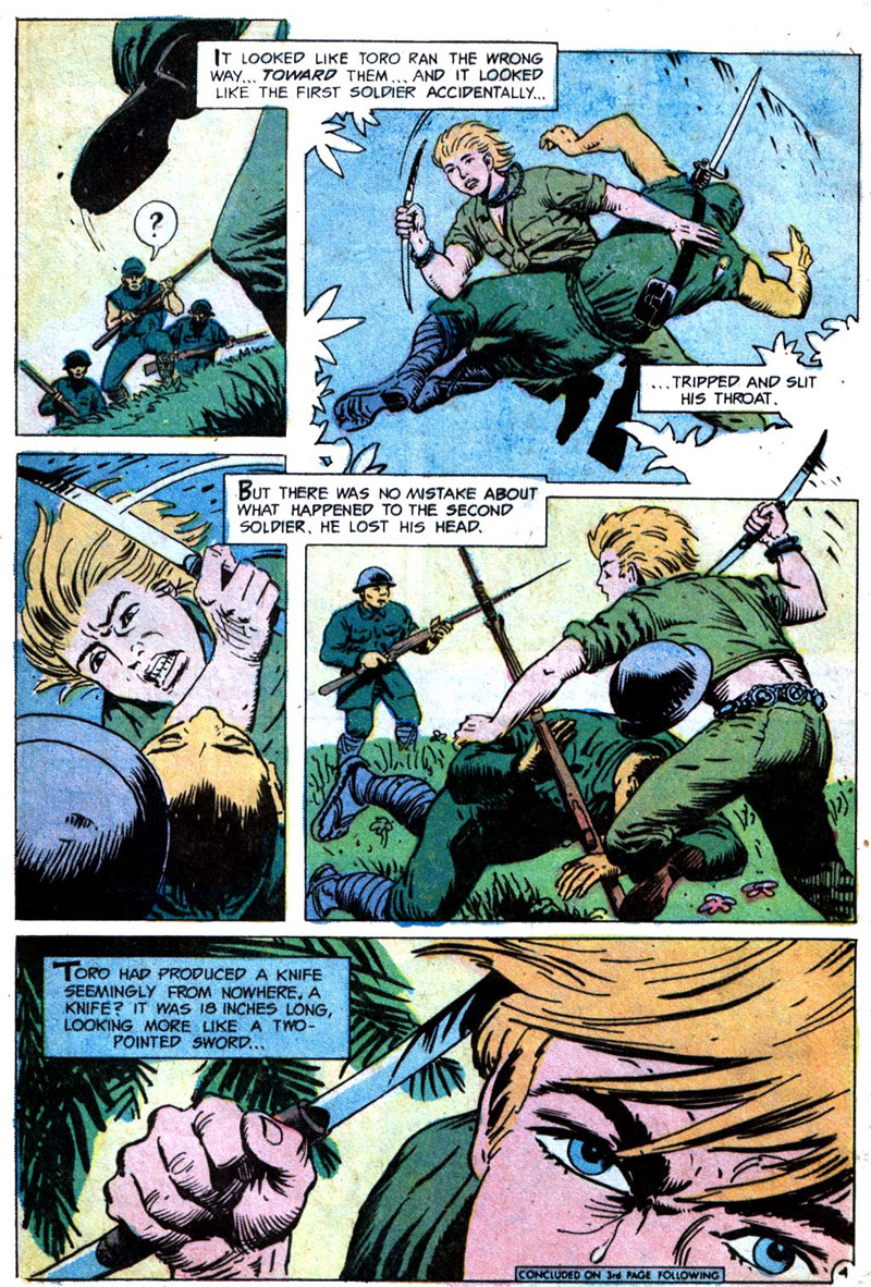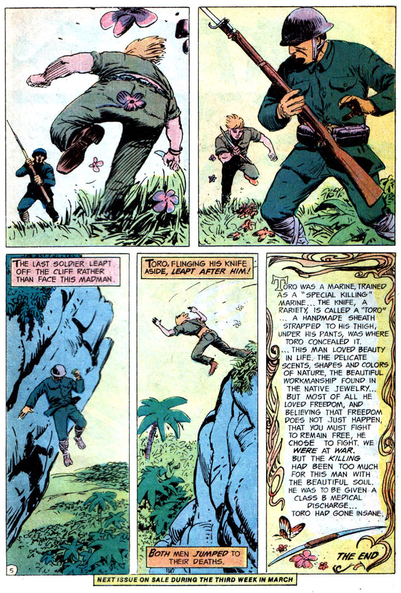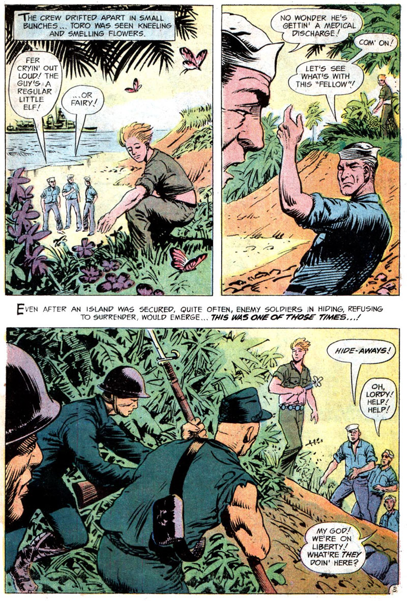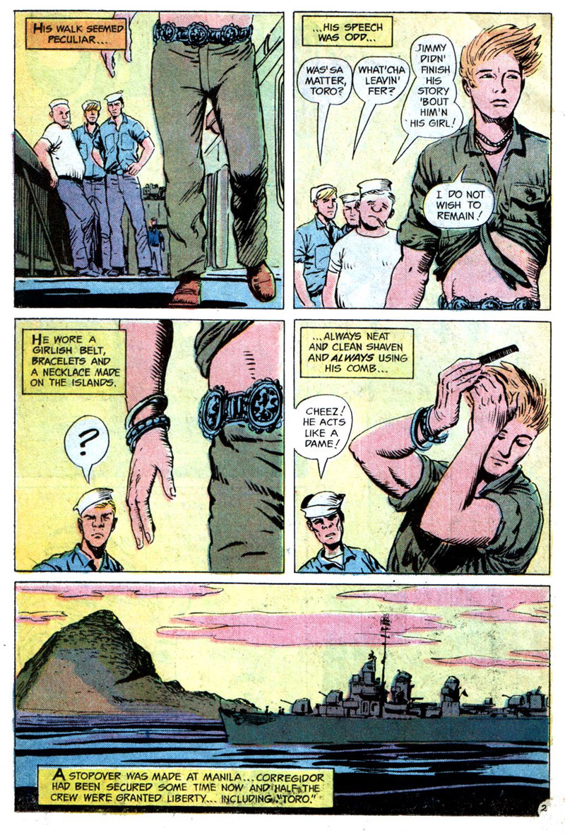 Toro isn’t the character’s real name and instead refers to a kind of knife. Its significance is made clear in the story. Made equally clear by Glanzman is that Toro is either gay or perceived to be gay because of his behaviors by his crewmates. You can draw your own conclusions, but Toro doesn’t read as straight to me in the least and I can’t recall another instance of a character calling another character a fairy in a Bronze or Silver Age comic. Considering that the U.S.S. Stevens stories in general have been noted as biographical one has to assume the account of Toro is as well. The story makes me wonder what kind of conversations happened between Glanzman and editor Archie Goodwin. Keep in mind that Glanzman did this story in 1974. The Comics Code had relaxed its guidelines three years before to allow certain horror or supernatural words and themes to appear in book titles, on covers, and in stories. The Code would not allow for open and positive portrayals of LGBT characters until its final revision in 1989.