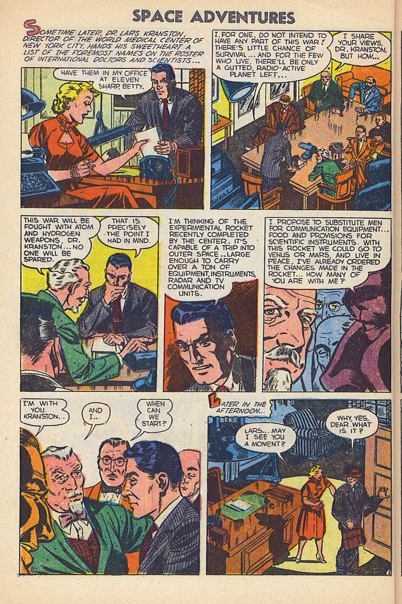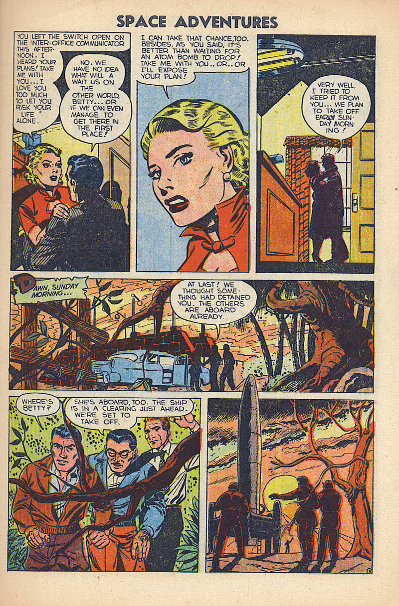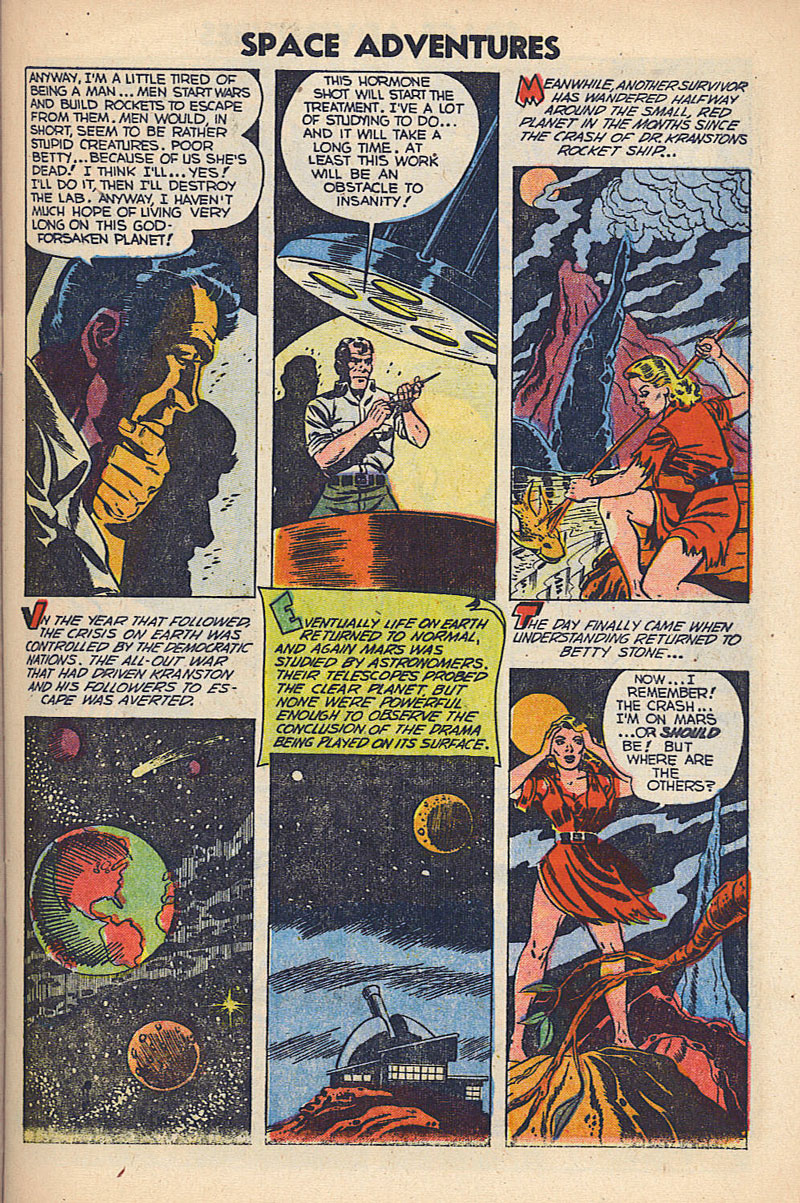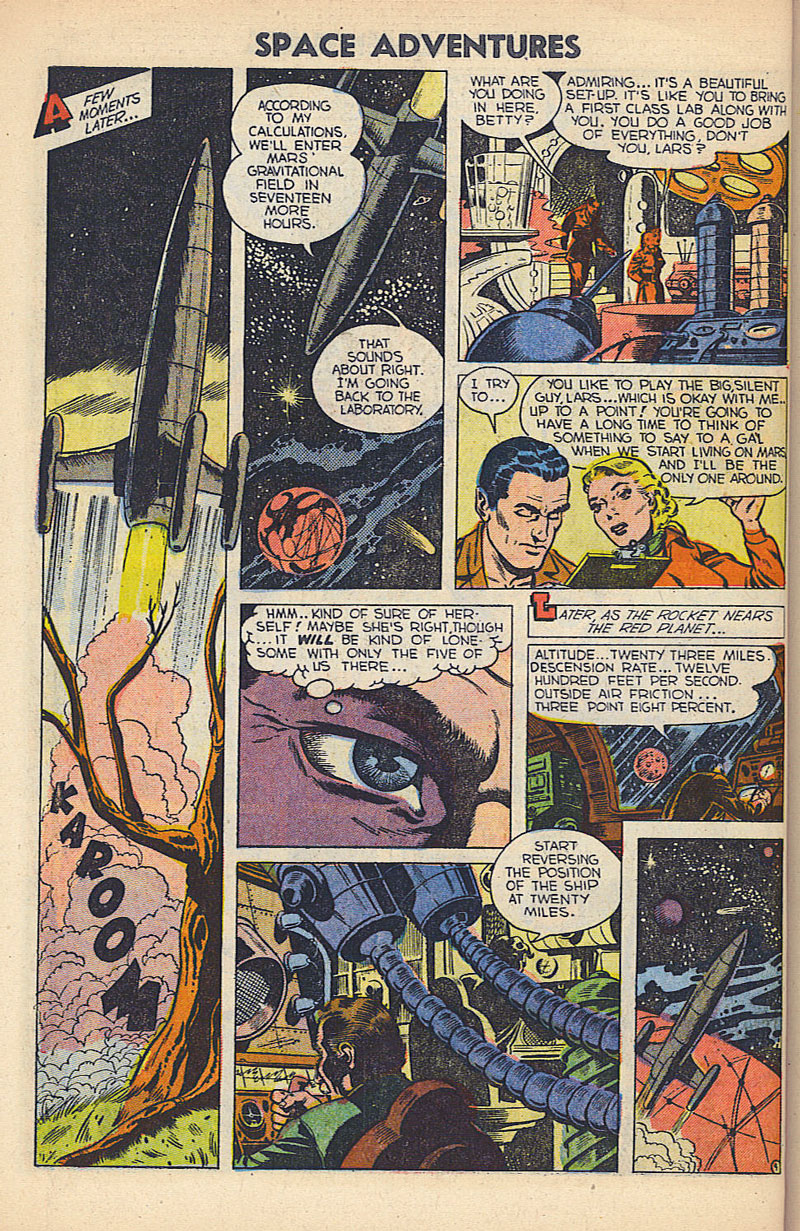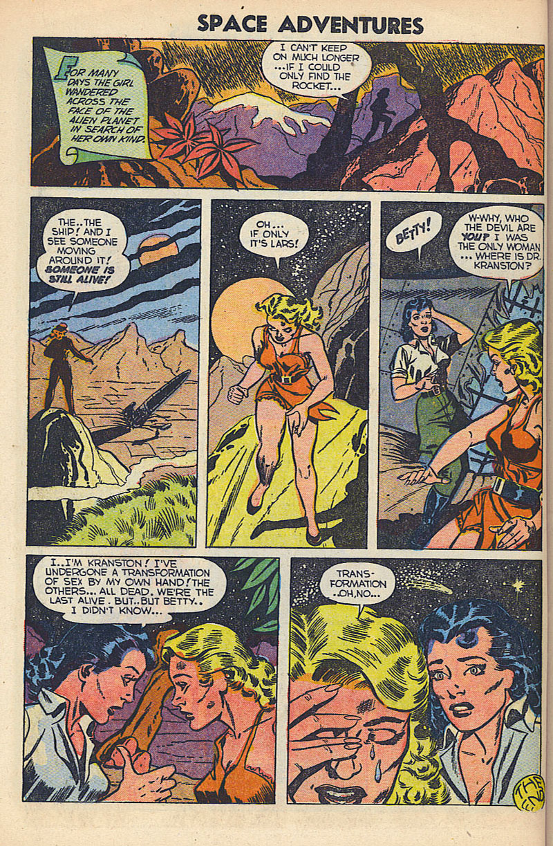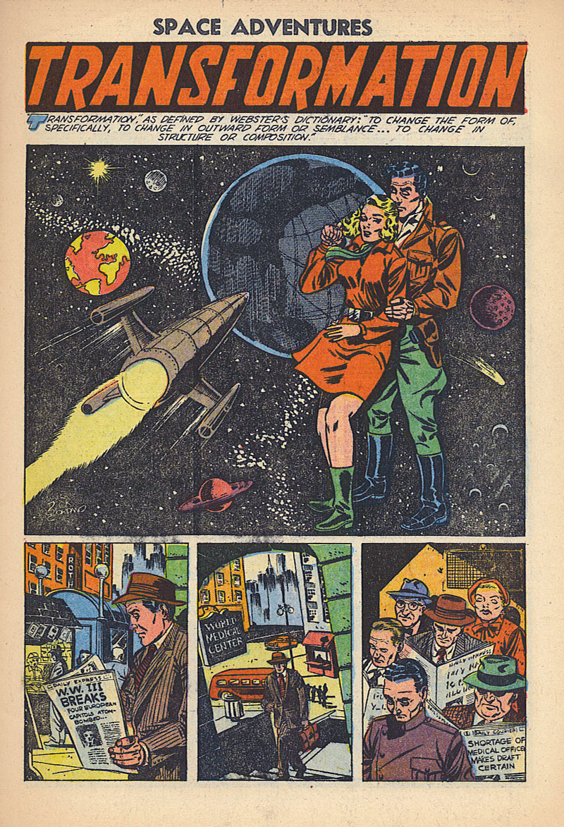 On December 1st, 1952 the New York Daily News ran the front page story “Ex-GI Becomes Blonde Beauty”. The former GI had been known as George William Jorgensen, Jr and took the name Christine while going through the process of sexual reassignment in Denmark, allowing herself to be used basically as a test subject by renowned endocrinologist Dr. Christian Hamburger. Much of the media wanted to turn her life into a salacious affair, Jorgensen was able to turn her experiences into a career as an entertainer and performer. Whether news of Jorgensen’s life tricked down to small town and rural America is something I can’t answer now, but certainly people living in large metropolitan areas would have known and talked about it. Perhaps her story served as inspiration for this short story titled “Transformation” in Space Adventures #7 published by Charlton Comics with a cover date July, 1953. Thanks to Francois Peneaud for tracking down the date. The Grand Comics Database doesn’t have a writer credit, and lists Dick Giordano as artist. What I find amazing is this story was published before the Senate hearings which led to the establishment of the Comics Code Authority.