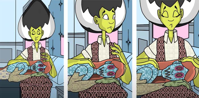 While Becoming Able and Justin Case share motifs — after all they exist in the same universe — there are a couple stylistic changes. Julien set aside the comic strip format with its interconnected plots that in which Justin was presented in favor of long form storytelling. Artistically Julien’s aesthetic is decorative in that his style is full of patterns and shapes while rooted in a cartoonist’s sensibilities. Here in this new story Julien ramps up the pattern play to maximalist effect. For me the results recall elaborate ornamentation on clothing often seen in Japanese ukiyo-e prints that I remember studying in Japanese art history classes. I know ukiyo-e prints are fairly obscure to most people so just think of the intricate pattern designs in kimonos and you’ll know what I mean.