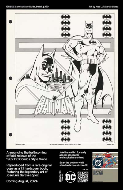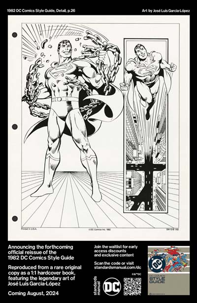 On June 3, 2024, NY-based publisher Standards Manual and Warner Bros. Discovery Global Consumer Products will formally announce the official and long-awaited reissue of the 1982 DC Comics Style Guide, reproduced from a rare original copy as a high-quality 1:1 hardcover book, featuring the legendary art of José Luis García-López.