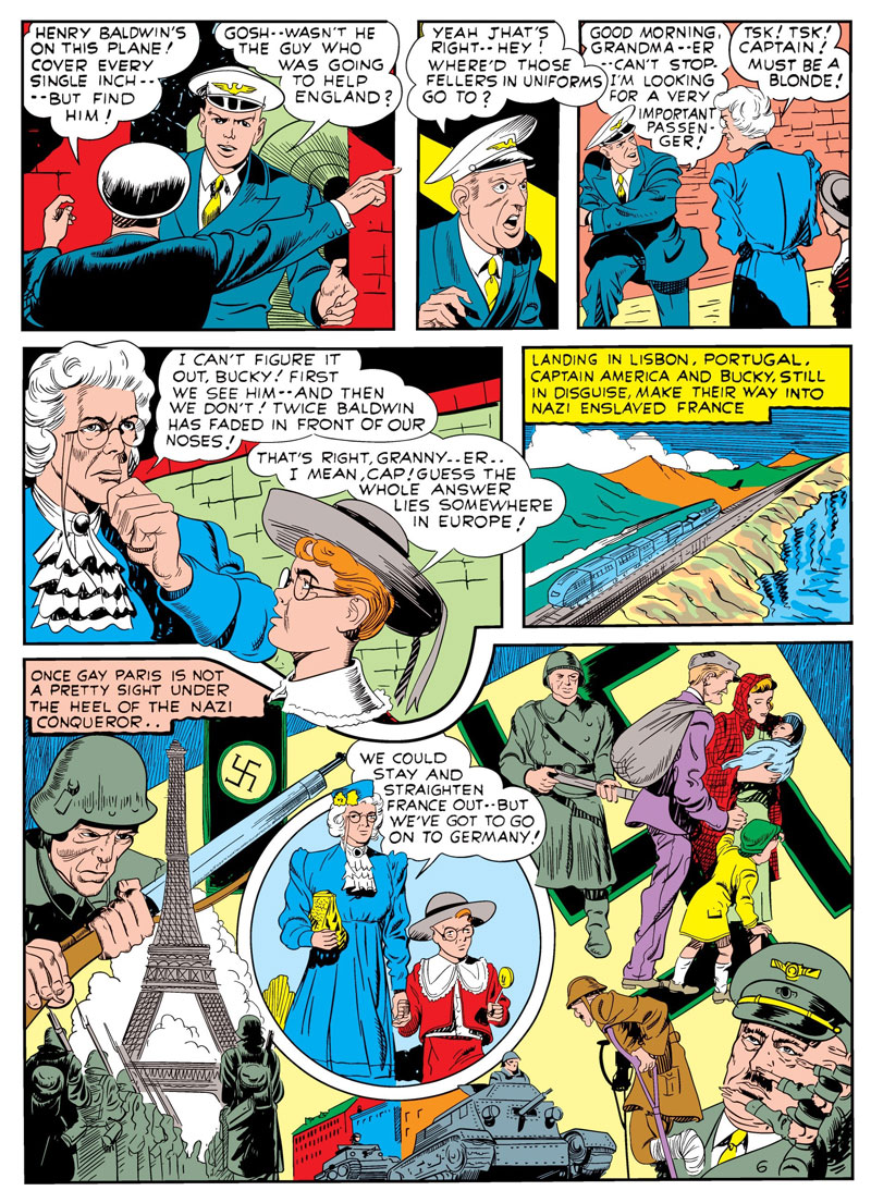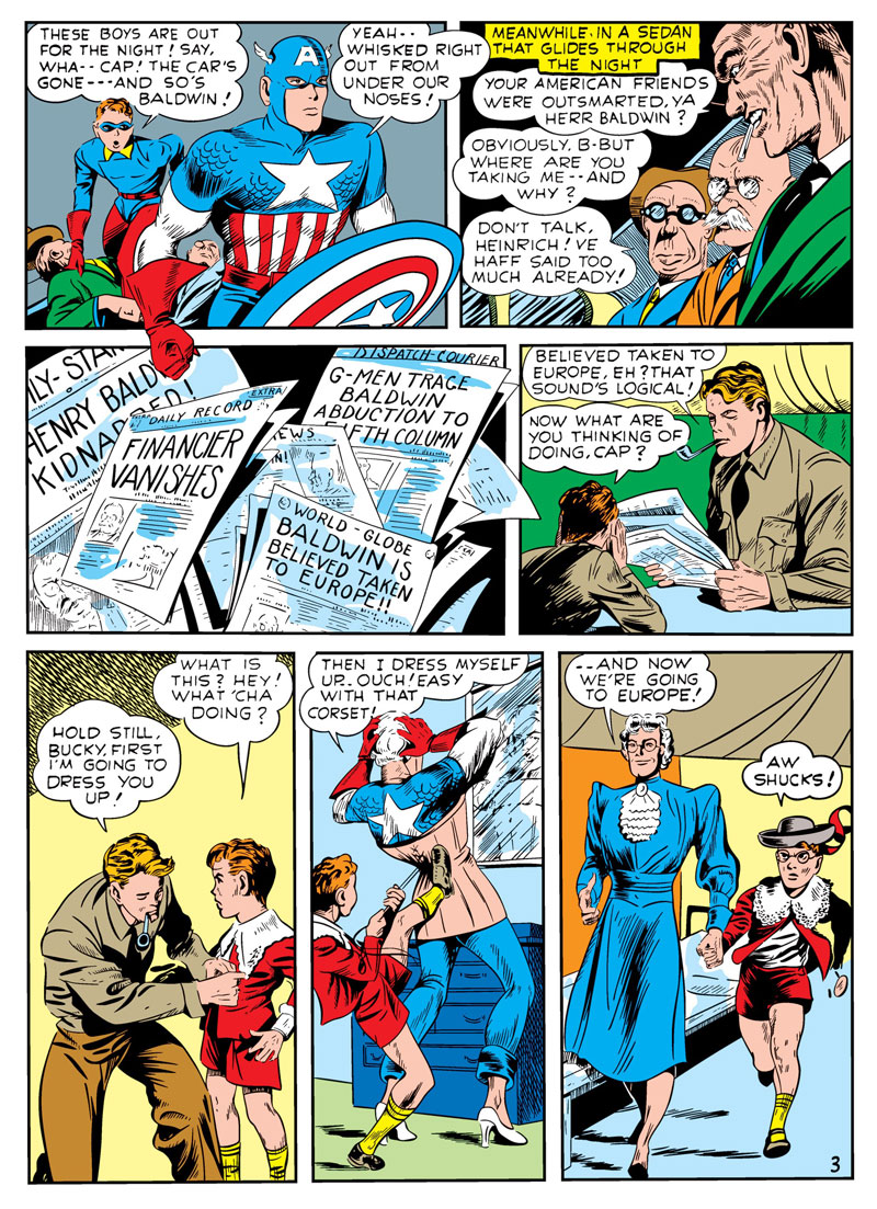 Trapped In The Nazi Stronghold is a Captain America story printed in Captain America #2 back in April of 1941, from Cap’s creators Joe Simon and Jack Kirby. A bit of a rarity for two reasons. The first being Captain America does drag – and not the fun, sassy kind of a dragthat you go out with friends to a club on a Saturday night to watch! Hell, no! Cap does prim, stern grandmotherly kind of drag. The other reason is this story was one of the few times a superhero engaged Nazis, in particular Hitler, before the US had entered into World War II. We didn’t directly enter the war until the Japanese attack on Pearl Harbor on December 7th. 1941. before then, one of the ways Americans became involved in the war was indeed through financial contributions to the British war effort, just like Henry Baldwin appears to do in this story.