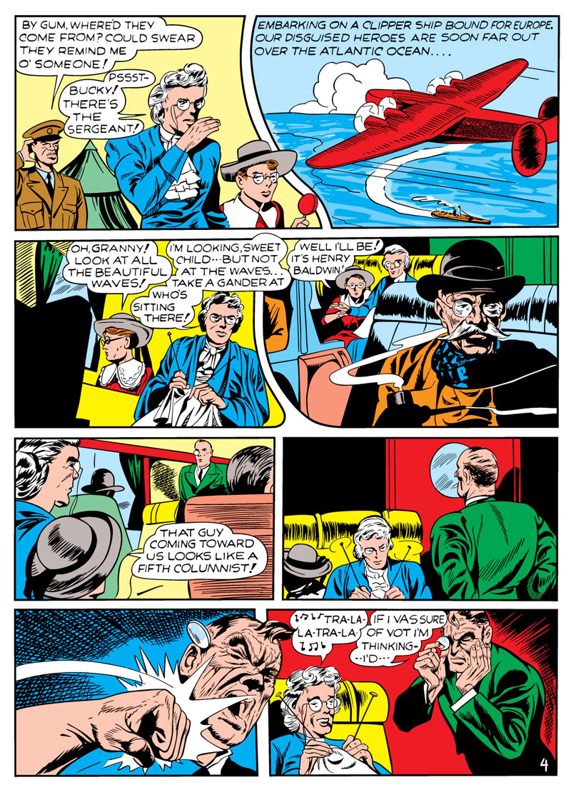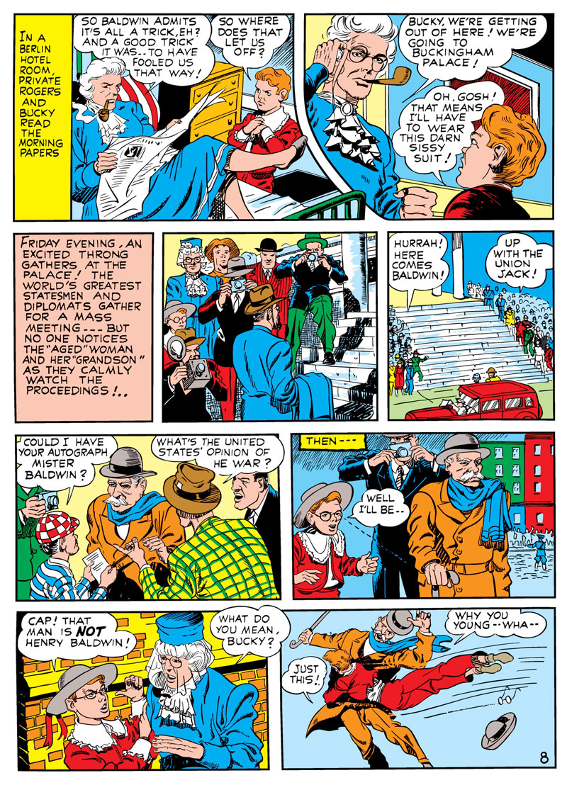 You’ll find the relevant pages of this fifteen paged gem here. The Grand Comics Database states the story was reprinted in Captain America: The Classic Years (1998), Marvel Masterworks: Golden Age Captain America #1 (2005), Flashback #29 (from DynaPubs, 1974). You’ll want to buy a copy of one of the books it’s reprinted in for entire story, though I’m led to believe that Cap and Bucky are in regular costumes in the other pages.