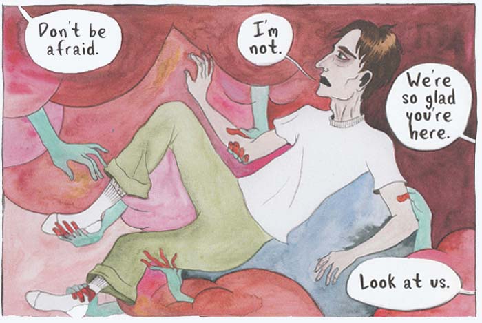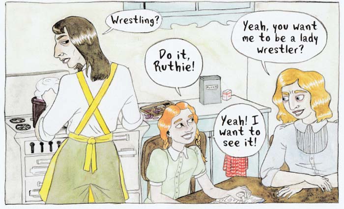 As a physical object Victory Parade has quite a presence. The hardbound case coupled with oversized dimensions (9 1/2 X 11) give the story another layer of substance. The endpapers with a kaleidoscopic image of Ruthie in the wrestling ring whispers of a Busby Berkeley dance number. Less noticeable though certainly important is the book’s sewn binding that will make this book last for years and years. None of which is to say that the story itself will be any less captivating and challenging if read digitally but if storage and money are not factors you might consider the print edition.