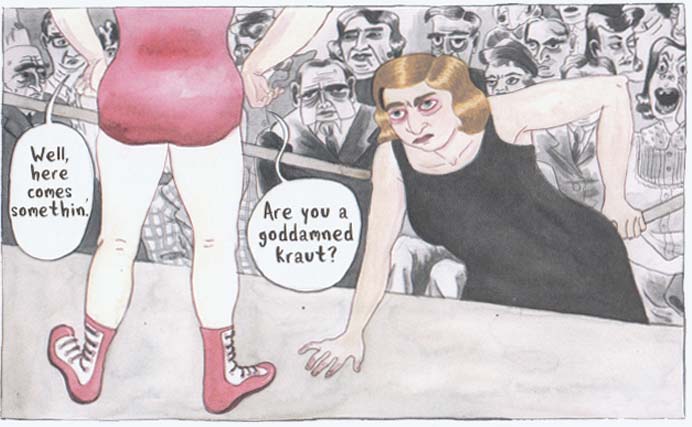 Hollywood movies gave countless numbers of people momentary relief and flickers of hope for the return of a better life throughout the Depression and wartime years. Take for example Busby Berkeley’s The Gang’s All Here with its glamour, stunning choreography, and Carmen Miranda’s unforgettable scene performing her Lady in the Tutti-Frutti Hat. It’s a perfect choice for Corman to illustrate this ritual with Ruth, and Eleanor in tow, using it to distract herself after fending off two repulsive sailors on shore leave. No matter how glitzy the musical numbers may be, a movie is only a fleeting salve for the justifiable anger Ruth feels over leaving her family behind to flee Nazi Germany. It’s this same anger that puts Ruth on the path to becoming a wrestler. Corman handles this transformation in a way that makes it a natural progression for the character. A sweat drenched Ruth in her fighting togs is both magnificent and terrifying. Her unleashed fury in the fight ring earns her the ironic nicknames “Ruthless Ruby, the Hun Heel” and “Killer Kraut” which appeal to the baser instincts of many working class Brooklynites sitting in the bleachers. Professional women wrestlers was an intriguing surprise to me and, a personal aside if I may, made for some conversation with my wrestling aficionado brother.