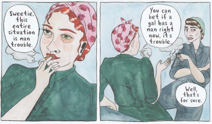A casually posed skeletal faced bathing beauty astride a girder greets you from the cover, a sort of solo Lunch Atop A Skyscraper but in heels a la Ginger Rogers. A lit cigarette seemingly creates a voluminous amount of dark smoke. Her feet point to emaciated corpses. To the right a trio uniformed women perform a task. You might wonder what this story is about. The simple answer is Leela Corman’s Victory Parade is the story of three women living in 1943 who at a glance may appear to lead mundane lives. However, their lives in Corman’s hands are anything but commonplace.