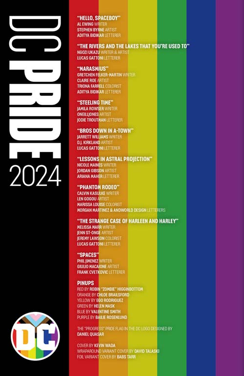 DC Pride 2024 #1, DC’s annual anthology containing all-new stories spotlighting LGBTQIA+ fan favorites, will publish on May 28. The 104-page Prestige format comic will feature a main cover by Kevin Wada, an open-to-order wraparound variant cover by David Talaski, foil and card stock variants by Babs Tarr, and Wada’s main cover offered as a 1:25 card stock variant. And don’t miss the rest of DC’s amazing DC Pride 2024 covers, on sale in June!