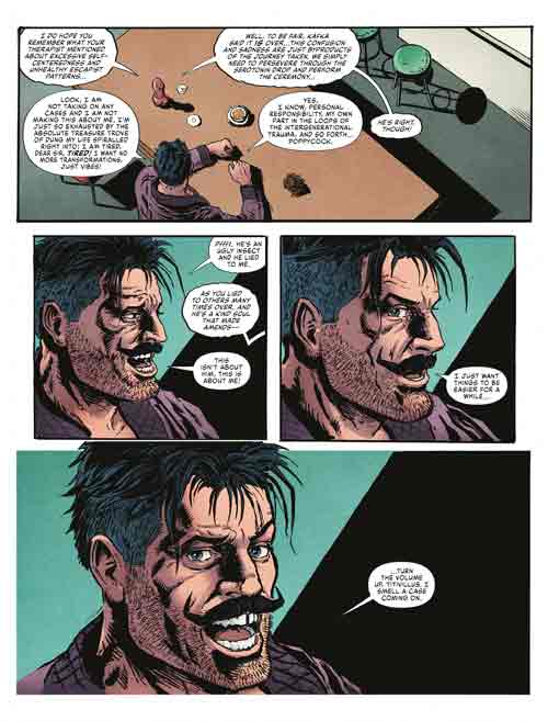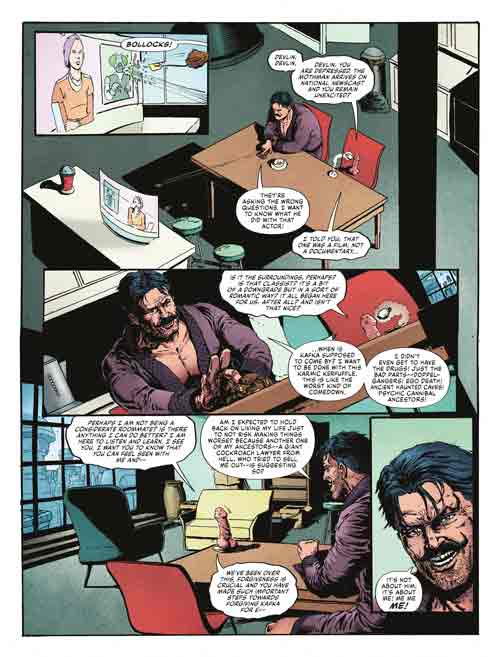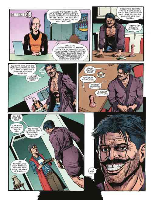 Alright, now that that’s out of your system what’s this all about? Simply this – Devlin Waugh returns to Judge Dredd Megazine (#465) on February 21st with writer Aleš Kot who is joined by artist Steven Austin along with colorist Matt Soffe and letterer Simon Bowland. “Nightclubbing” will see Waugh dealing with anti-gay hate crimes as the story unfolds each month. The publisher gave me a sneak peek and reading the first installment has me quite intrigued for more. A note of caution should this be a concern to let you know the opening sequence does depict an act of anti-gay hate. The following preview pages of the first chapter of “Nightclubbing” are from another scene.