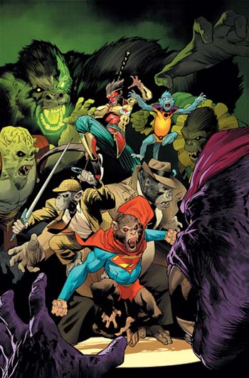 Gorilla Grodd’s recent incarcer-ape-tion in the pages of DC’s The Flash comic book series has left a void that Monsieur Mallah is more than happy to fill. Ape-sembling a group of the DCU’s most sinister simians, Mallahforms the Legion of D(oo-oo-ah-ah)m, with an eye toward worlddomin-ape-tion. But the world won’t be conquered that easily!Enter the all-ape JUNGLE L(ee-ee)gue. Can this team of hero-eekanthropoids be the salv-ape-tion we need, or will Mallah’s team of maniacal monkeys bring forth the ape-pocalypse?