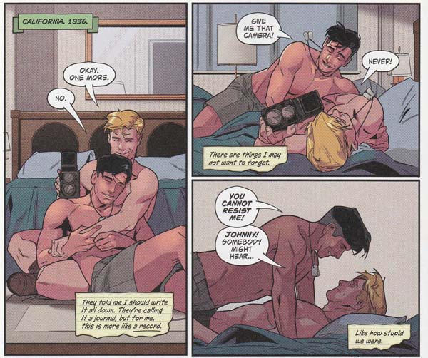 Cian Tormey is the artist who collaborated with Tom Taylor on the Superman: Son of Kal-El comic featuring Jon Kent and his boyfriend Jay Nakamura. While I very much miss that series having Tormey drawing this mini series is a real pleasure thanks to Tormey’s unfussy contour line style that makes any project he’s working on feel instantly inviting and visually accessible. The two page sequence with Alan and Johnny secretly holed up in an out of a way motel is a sheer delight. Along with the sexiness of boxers, boots, and dog tags, Tormey conveys playfulness, and affection of two young men in love made all the more precious by the stigma of the time.