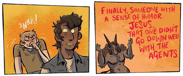 The tension Nahil and Williams have been building since the opening pages palpably ramps up as the friends are discovered by Garrett and Mullein while trying to hide in the woods and then confronted by a sublime horror literally manifesting in front of them, drawn by Mitch’s distraught and angry emotional state. “Better the devil that you know than the devil you don’t know” is an old saying that simply does not hold true when the devil you know wants to do you harm as is the heart poundingly tense situation in which they find themselves. As a survival mechanism marginalized people develop quick wits and the ability to tell friend from foe. Relying on this skill, Mitch realizes they’re all safer embracing the all too very authentic devil standing before them. Nahil understands how a little black humor amplifies horror. Here are two examples of Williams visualizing it.