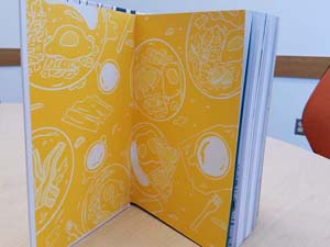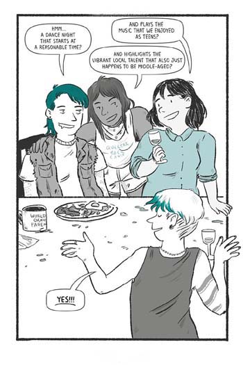 A few words about the book itself because it’s simply beautiful as an object by itself thanks to several design choices. The eye catching dust jacket design by Andrea Miller uses Bongiovanni’s art B & W art with spot coloring against an ombre teal green background graces front and back covers. Removing the dust jacket reveals split views of the main cast on a field of white. An illustration of the friends’ brunch plates from bird’s eye angle are colored in sunny yellow and white to make the end papers and the book tape matches the color choices. In case you’re wondering, the tape is a piece of cloth to which the pages are sewn and then attached to the book covers before the end papers are attached. Finally, the book uses Smyth sewn square case binding to attach the pages to the spine which means they won’t come loose easily and the book itself is strong and durable. These last two items may seem like small details but the fact that someone gave attention to these fine points speaks volumes about the quality Abrams put into this book. While many people understandably have a preference for reading digitally, these are the type of flourishes, if you will, that seem to translate differently if at all into the digital reading experience. Overall this is a book design to take pride in.