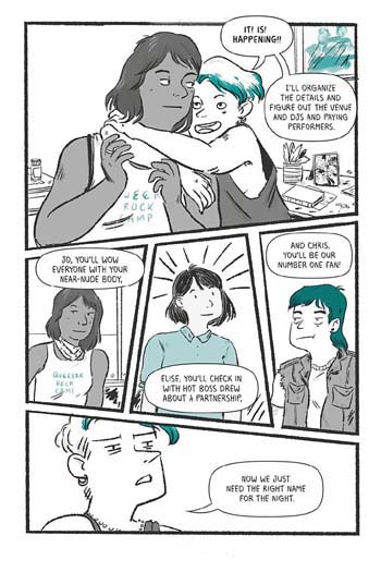 Relationships are at the core of Mimosa whether it’s the main one with the quartet of friends, or the individual ones among them, or the one between Chris and their child Pepper. Bongiovanni’s exploration of two specific ones are especially interesting. The first involves Chris and Elise while the other includes Jo and Alex. Chris and Elise began as friends and later became roommates. Elise made the decision to move into Chris’ house to help out financially and emotionally in the wake of their notably terrible deed that got them blackballed. The pair arguably have the most nuanced relationship of the four though this doesn’t stop them from bickering and even letting each other down at difficult moments when support would be welcomed. What keeps their friendship intact is a good deal of self examination and commitments to honesty and doing better.