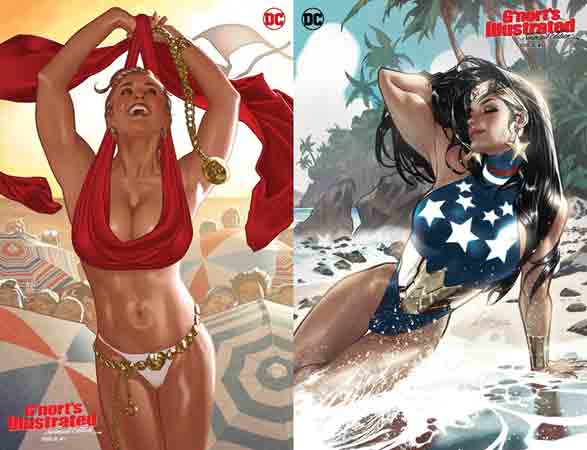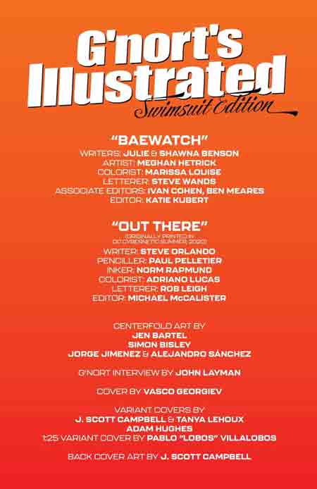 G’nort’s Illustrated Swimsuit Edition will feature a main cover by Vasco Georgiev along with open-to-order cardstock variant covers by J. Scott Campbell & Tanya Lehoux, Adam Hughes, and a 1:25 variant cover by Pablo Villalobos. All four covers will feature J. Scott Campbell’s “Gotham Magazine” artwork on the back.