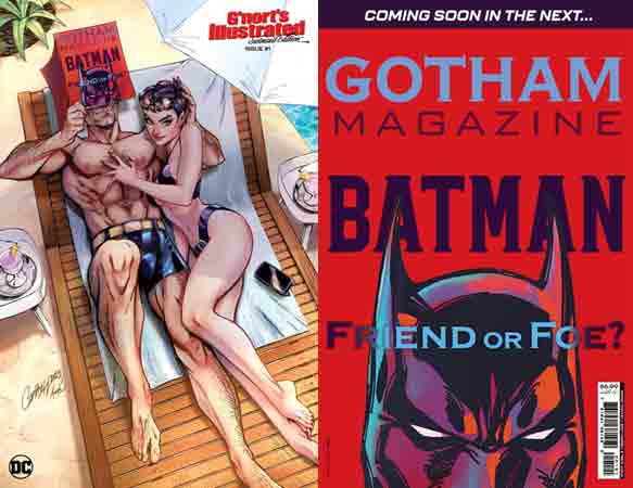 Thanks to the magic of comics, you can join in the beach blanket fun by recreating J. Scott Campbell & Tanya Lehoux’s variant cover for yourself! Grab a friend, pull on your swim trunks, hit the beach with your copy of G’nort’s Illustrated, and snap a photo—the back cover of G’nort’s Illustrated Swimsuit Edition features the same “Gotham Magazine” artwork that Batman holds over his face on the front!