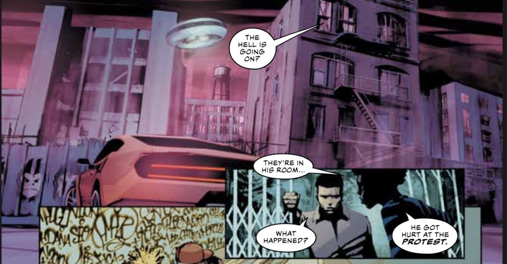 Nostalgia #3 picks up shortly after the events of the second issue – a time jump similar to between issues 1 and 2. Hoffman uses it as a successful technique to jump into the plot of the story without sharing every detail of how we got here after the bigger, more consequential event preceding it. I like its use, but I don’t think Craig Mancini, aka Nostalgia, does nearly as much as it quickly drops him back at the Synod lair and into confusion about what happened to his son, Nathan, aka Nautilus, who is suffering from a gunshot wound from the police force of this world.