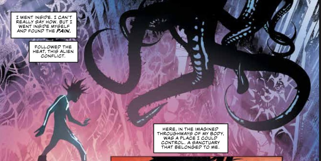 In particular, Žeželj delivers some beautiful panels and pages of floating and falling characters, and consciousness, similarly to the initial two issues. The dialogue and thoughts Hoffman provides wonderfully balances these sequences in almost a dreamlike way in which they speak to unconscious minds and the work our subconscious does to make sense of those experiences.