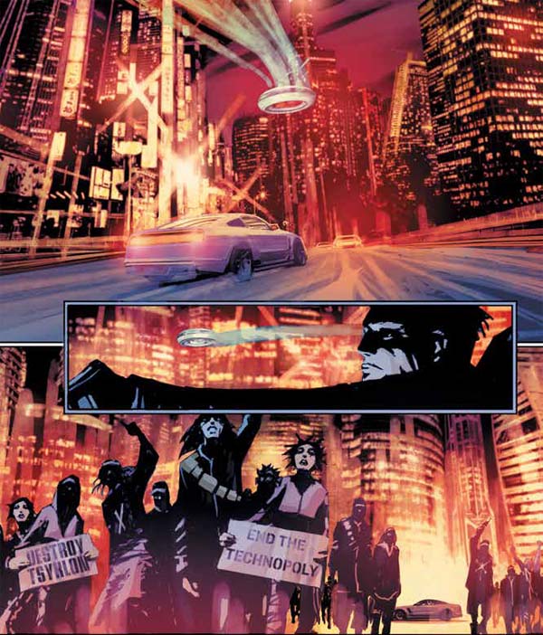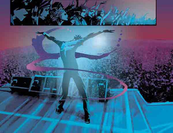 The set up for this story is compelling, especially given Hoffman’s experiences in the music industry and undoubtedly his connection with music, performance, fans and fame. Plenty of layers to explore “connection” through this unique lens and how we are more connected than ever before via technology, but less connected as human beings and the planet we call home. This dissonance attracts me to the story as well as Žeželj’s art and Loughridge’s colors. Žeželj’s pencils provide an epicness to the story. There’s an immensity here in the backdrop to the city and background of the story. His portrayal of the characters and their expressions give me a haunting feeling as we delve into this world of inequity, control, ambivalence and lost spirit. Loughridge’s reds, blues, greens, yellows and oranges are vibrant – not something typically seen in dystopian storytelling – and almost neon in their intensity that eventually diffuses out to black in the panels. As a clubgoer of the 2000s and 2010s, that intensity reminds me of nights out, fun and frivolity, and perceptions of light and space from the dance floor, a welcome juxtaposition to consider with the themes being explored here.