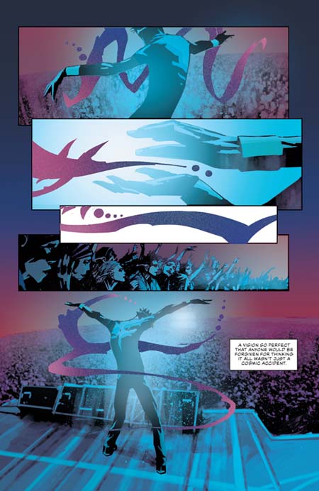 “I culled a lot of ideas from my personal experience and the incredible 12 years I spent in the band Scissor Sisters (2024 brings the 20th anniversary of our first album!),” says writer Scott Hoffman. “I also studied writing at Columbia University and am a big reader and fan of comics. Part of my intention with NOSTALGIA is to bring back my own nostalgia for an era of comics that I feel close to, particularly the 90s subversive Vertigo days—edgy, somewhat literary, more adult.”