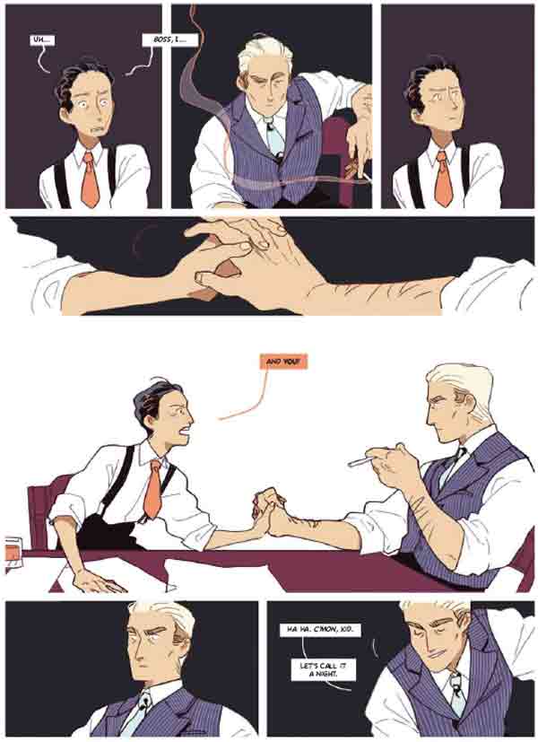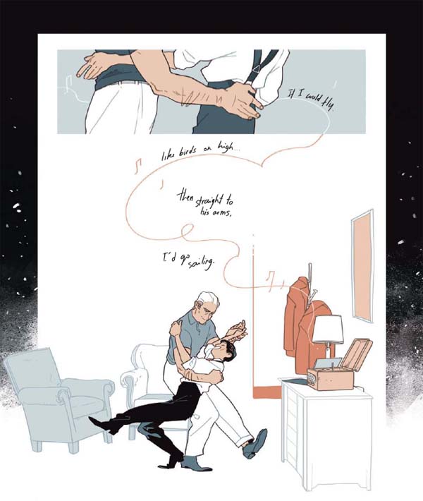 There is much to like about this story. Period settings in media be they graphic novels, movies, television, or novels will always capture my attention. This is especially so when queer characters are featured. For an elder gay like myself who came of age in the 1970s and felt lonely in a heteronormative wasteland such period pieces speak to the truth that we have always been here. A queer romance story between two opposite types will likewise pique my interest though whether it keeps it is another matter which fully depends on the ability of the creator to flesh out their characters and generate tension to move them forward in some fashion. While the plot and pacing advance — two years here, three there, and another few before making a dozen year leap — a delicate balance is achieved between important events in their criminal ventures and intimate moments between Adam the criminal kingpin and young protege Jules as they cautiously navigate their secret relationship to avoid fatal consequences. While Smoke Gets In Your Eyes is a romance it is also a character study of its main characters as their relationship and their personalities change over the years. Flogny takes readers along as she skillfully reveals the couple’s developments and shifts right to the very end.