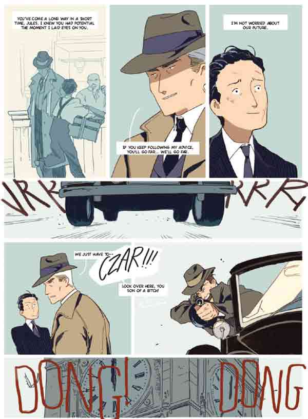 Flogny’s story charts the love affair between young Italian immigrant Jules Tivoli and the older Adam Czar spanning the years from 1938 to 1960 with locations moving from Chicago to New York to the Mediterranean port city of Marseille. It’s quite an intriguing meet cute that Flogny has created for Adam and the Jules that will change their lives forever. In the eight years since Tivoli arrived in the US he’s worked only at menial delivery jobs and barely held on to a tiny single room apartment all the while experiencing bigotry at a time when many Americans felt entitled to express disdain of Italians. In nearly every way Czar is Tivoli’s opposite: a stocky and muscular build, impeccably tailored suits, neatly cut hair, a car and a home all afforded to him by a mysterious job all of which combined demand respect from local store owners, his associates, and average passersby. Without exception Czar drops in weekly at Meek’s Liquors during Jules’ delivery and always gives parting backward glances at Jules. Tivoli notices Czar’s fleeting looks as well as the envelopes he always leaves with. He’s intrigued by Czar’s sophistication, respectability, and air of power. After years of being looked down upon Jules desperately wants a taste of the same for himself and so he “breaks the ice” by creating a commotion that ironically sends him running to his tiny apartment. A week later Czar knocks on the younger man’s door and Jules finds himself accepting a proposal leading to a completely new life filled with opportunity and danger and, yes, romance!