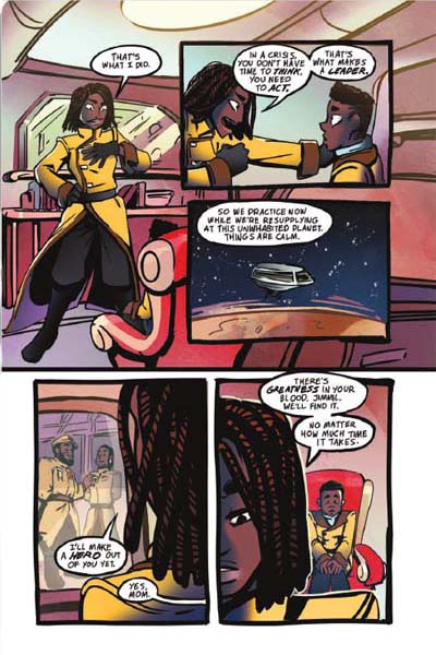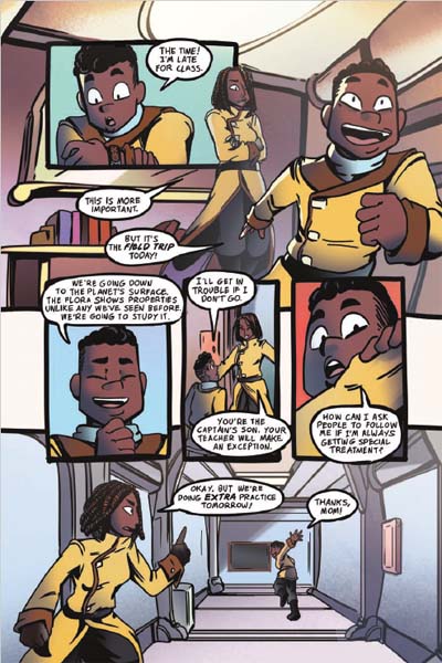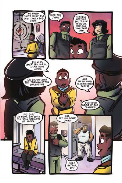 Humanity has gone to the stars, and the ESS Khonsu and its crew are leading the charge to explore the galaxy. As the son of the ship’s captain, Jimmil might not always live up to his mom’s expectations… but right now he and his friends might be the galaxy’s only hope. After they’re stranded on a strange alien planet, they’ll have to do what their parents couldn’t: explore the surface, discover the secrets of the terrifying race that lives there, and try to prevent a full-scale war! Working together, these Cadets will discover that sometimes being a hero means learning to see new perspectives, and sometimes bravery means admitting when you’re wrong. — a 160-page, full-color softcover graphic novel with 3″ French flaps (6″ x 9″)