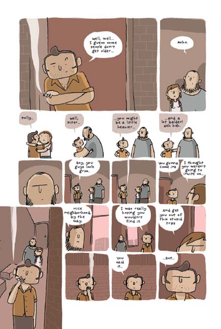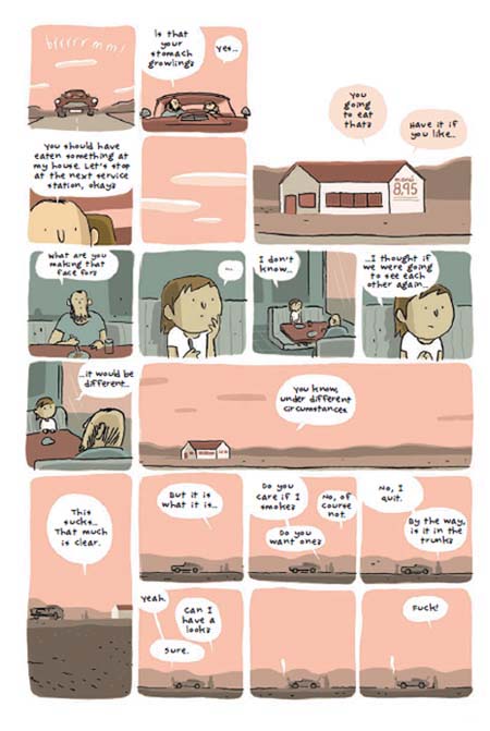 Another factor making Ashes an interesting story is its madcap pacing punctuated with a variety of locales including a hole in the wall diner with wrestlers, half sunken ships, an island full of abandoned deer, and an eerie mansion seemingly in the middle of nowhere. Ortiz has one more trick up his sleeve with his cartoon style linework and muted color palette. Together they make for a appealing visual style that draws in reader while contrasting the intricate plotting.