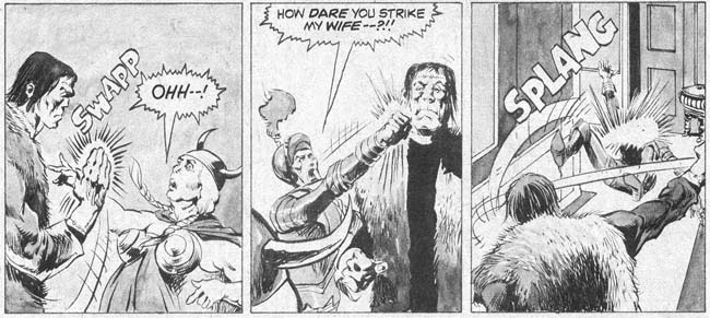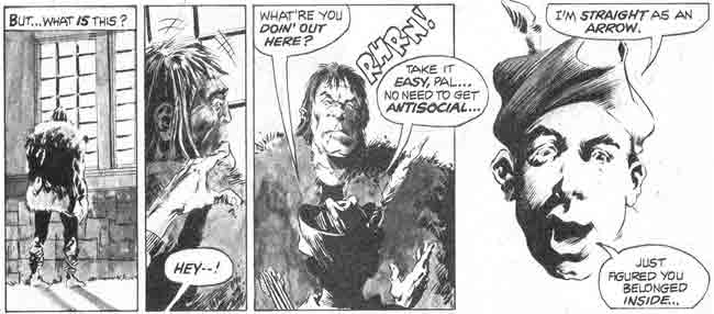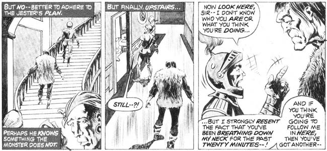 In the next few pages Moench has the Monster mingling with some of the guests including Cynthia who shares a short dance with him. They’re not freaked out because everyone thinks he’s wearing an incredible costume. A man in a jester costume notices how Frankenstein has been observing Cynthia and pretends to take the Monster into his confidence by telling him Cynthia’s life is in danger by another partier, her own husband (George) who’s wearing full knight’s armor. Jester recruits Frankenstein to keep close tabs on George. The monster does exactly that until this scene occurs near a bathroom.