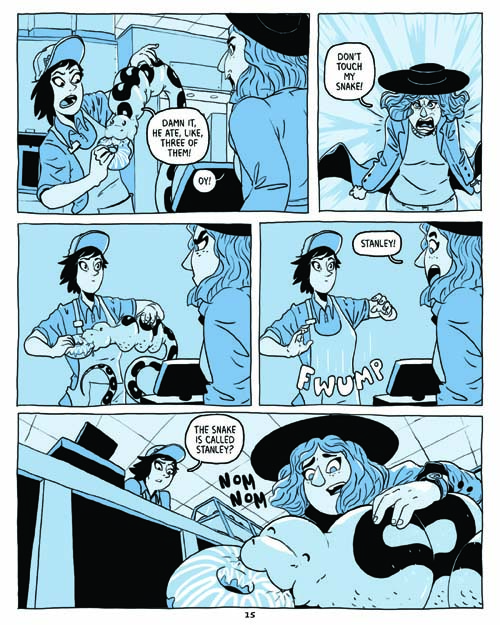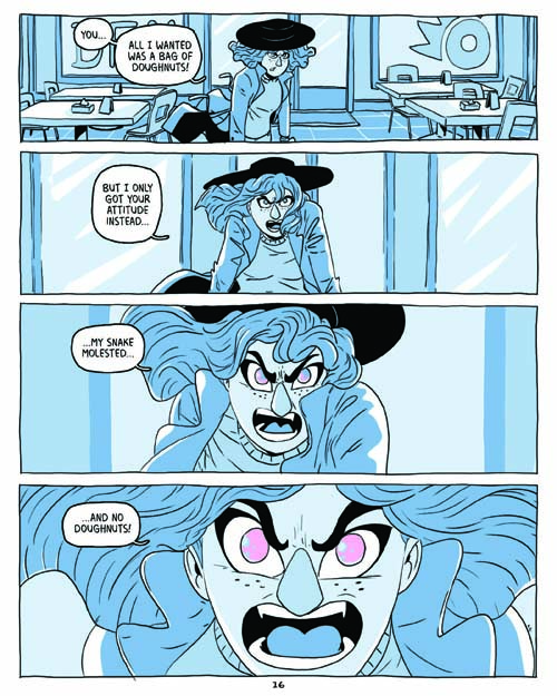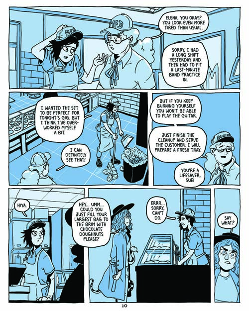 It’s a simple premise whose success largely depends on the quality of characters a writer creates and Lorinczi does not disappoint! There’s more to Margot and Elena than meets the eye. They’re both just trying to succeed in life while finding themselves under pressure each under pressure from their own snide and condescending personal villains that you’ll love to hate. For Margot it’s witch examiner Katie Banks who delights at the prospect of marking Margot a failure on a critical exam. Elena just wants everything perfect for her band gigs at Tizzy, a local bar managed by the perpetually cranky and eager to clash Vince. Really though, Elena doesn’t want to disappoint her band mate, childhood best friend, and ray of sunshine Bob. Sue is the empathetic coworker everyone deserves. And then there’s Margot’s witch familiar Stanley the snake whose presence Lorinczi makes quite loveable simply by his good nature and love of sweets. Even the most minor of characters such as Witch Hub desk clerk George and delivery man Dave are given personalities along with their purpose.