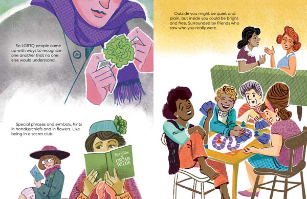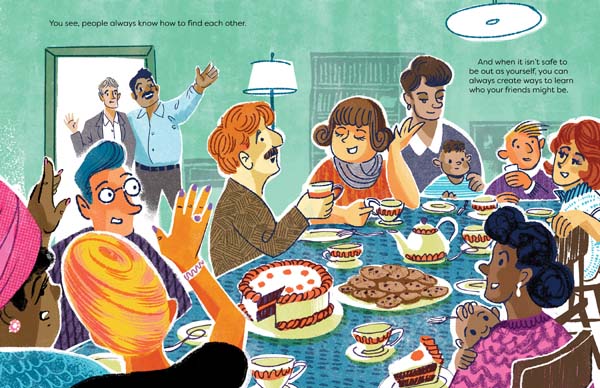 Inside the book’s covers Lukoff and Hastings give young readers a view into those all too often precarious times. The text begins with Lukoff simply posing the titular question and giving examples of people in various situations when it would be wise for them to rely on speaking in coded language. As the story progresses page by page Lukoff introduces new aspects regarding the historical period. There are many depictions of queer life and the ways in which joy and happiness prevailed despite duress. From dances to parties to game nights to innocuous chats to dinner gatherings to camaraderie between sailors at sea — all of which came about after someone answered “Yes, I’m a friend of Dorothy.”