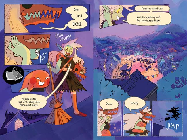 High above in the sky a dragon masked Beetle spins a tale anticipating the arrival of dragons from near and far as the towns people eagerly begin celebrations for the three day long Chimera Carnival festival! Once Beetle and Penny are back on land they join Gran as they await the arrival of Kat from nearby Big Town. With pleasantries exchanged it’s time to start the revelry! It’s a girls night out for Gran and several of her friends while the younger trio wander the streets catching up. The Carnival is a special occasion that happens only once every decade because the energy of usually solitary dragons gathered in one place for too long can pose danger. For Beetle and Kat though…the evening has a much more personal meaning because the two girls are in the throes of young love!