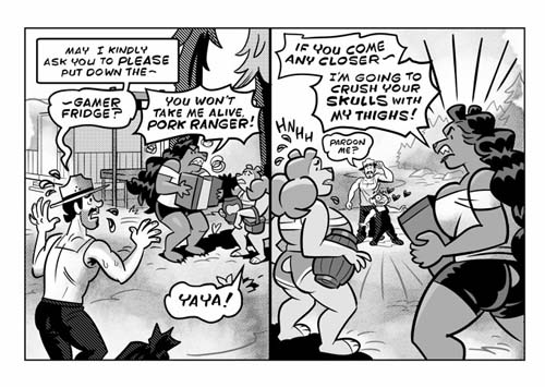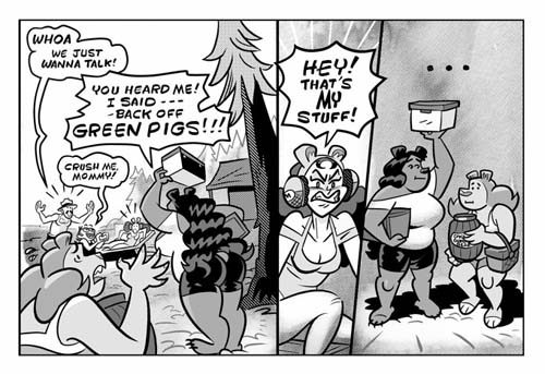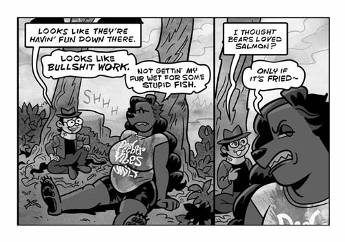 Welcome to beautiful and scenic Cascadia Falls National Park! Commodified, gentrified, consumerized, and digitized, the Elysian environs of 21st-century Cascadia is now just more Content©™… and so are its hopelessly-acclimatized-to-tourists bears, Ginger and Yaya. Involuntary beer mascots and social media stars, they’ve forgotten how to bear entirely, much to the frustration and chagrin of their park ranger caretakers, Eggs and Ricardo. But things are getting weird now, even for Cascadia. The exploitation’s been kicked up a notch, with a mysterious SUV and colonizing copycat among the new crop of troubles threatening the park! Can bear and ranger, hand-in-paw, push back against the invasion? Or are they as doomed to digestion for digital gain as the rest of us?