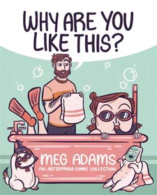 And it really is, making the synchronicity of the moment the perfect excuse to write about Adams’ first ArtbyMoga collection titled Why Are You Like This? But then any occasion or time of the year is a good time to write about the lives and gentle (mis)adventures of the extroverted Meg and her introverted husband Carson and dogs Boedy and Luna. Adams sets of the tone of her book with a charming introduction before pulling a glam showgirl style surprise that had me hooked and hankering for more.