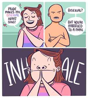 While the great majority of Adams’ topics are lighthearted snapshots of daily life a few touch on the subject of self care and mental health. Their loving and supportive messages convey the insight of personal experiences with depression. On a different note the following cartoon will speak volumes for many people in the bisexual community. However, it does not appear in the book though once I saw it I thought that it was too good to pass up.