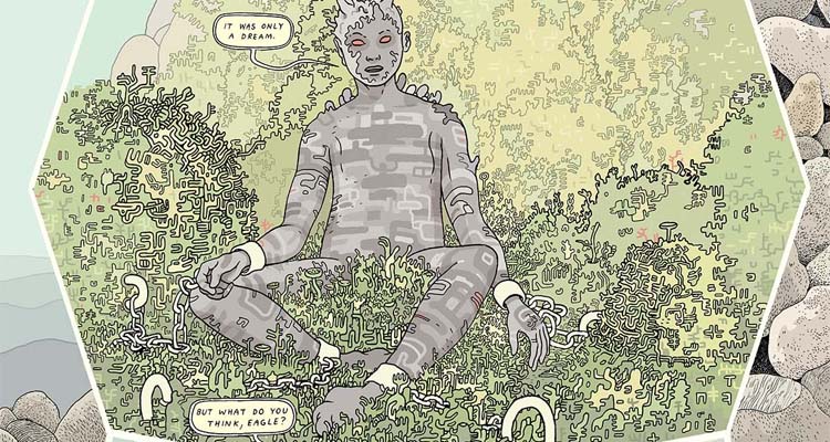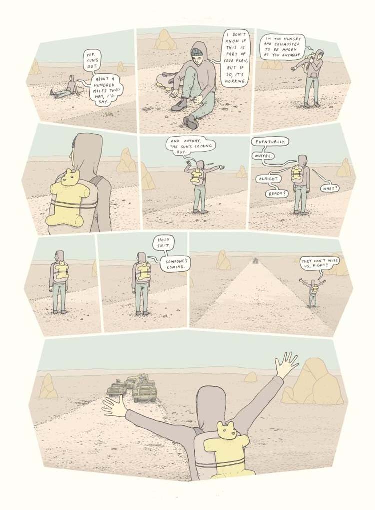 The mention of Prometheus is what drew my attention to Anders Nilsen’s recently released graphic novel Tongues. Between its covers Nilsen explores the story of Prometheus by bringing the eternally bound Titan into the present day as his beloved humans become a point of contention with other gods for the threats they pose to their fellow humans and the world. Intertwined with Prometheus’ plight is a young girl named Astrid who reluctantly sets off on adventure to safekeep a mysterious cube while a young man accompanied by teddy bear strapped to his backpack wanders a desert to discover he’s unwittingly caught between rival factions.