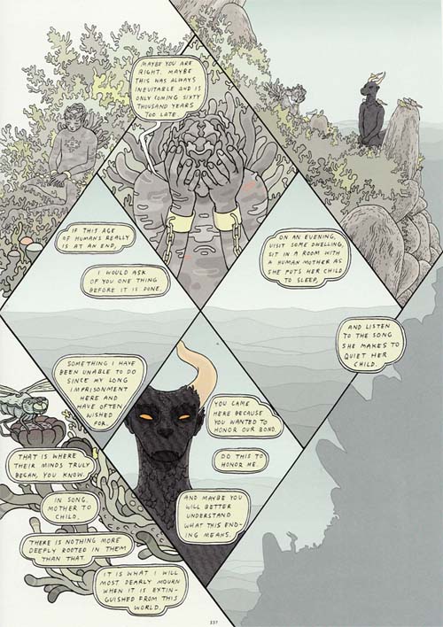 JP: Another design element prominent in Tongues are various geometric shapes of varying complexity. These elements have appeared in some of your prior work such as Big Questions where they’re used both in stories and also the cover as is also the case with Tongues. The take on an almost logo aesthetic in Rage of Poseidon. They’re very intriguing in appearance and with my first exposure to them being in Tongues I’m thinking of them as a sort of sacred geometry. Would you talk about their usage and meaning in Tongues and your other work?