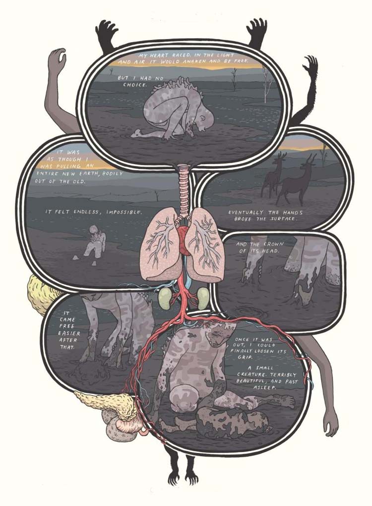 As for Poetry is Useless, yes, that book is basically just scans of my sketchbooks. The drawings reproduced outside the scanned pages are just bits I liked where the rest of the page maybe wasn’t that compelling. It’s made up of comics and drawings that are less planned, less carefully executed, more situational and improvisational than my other work. There’s a lot of me drawing on trains or out in the world at cafes and kind of responding to what’s around me. In a way it’s my favorite book. It’s the most playful and inventive work, and it feels in a way the most alive and uniquely ‘me’ somehow. It’s not the only way I want to work, I’m very much enjoying working on Tongues, too, even with all the necessary planning and labor, but if an asteroid came down and destroyed all my books, sparing only one title, I might hope it’d be Poetry is Useless. Probably. Maybe ask me again after Tongues Volume 2 is finished.