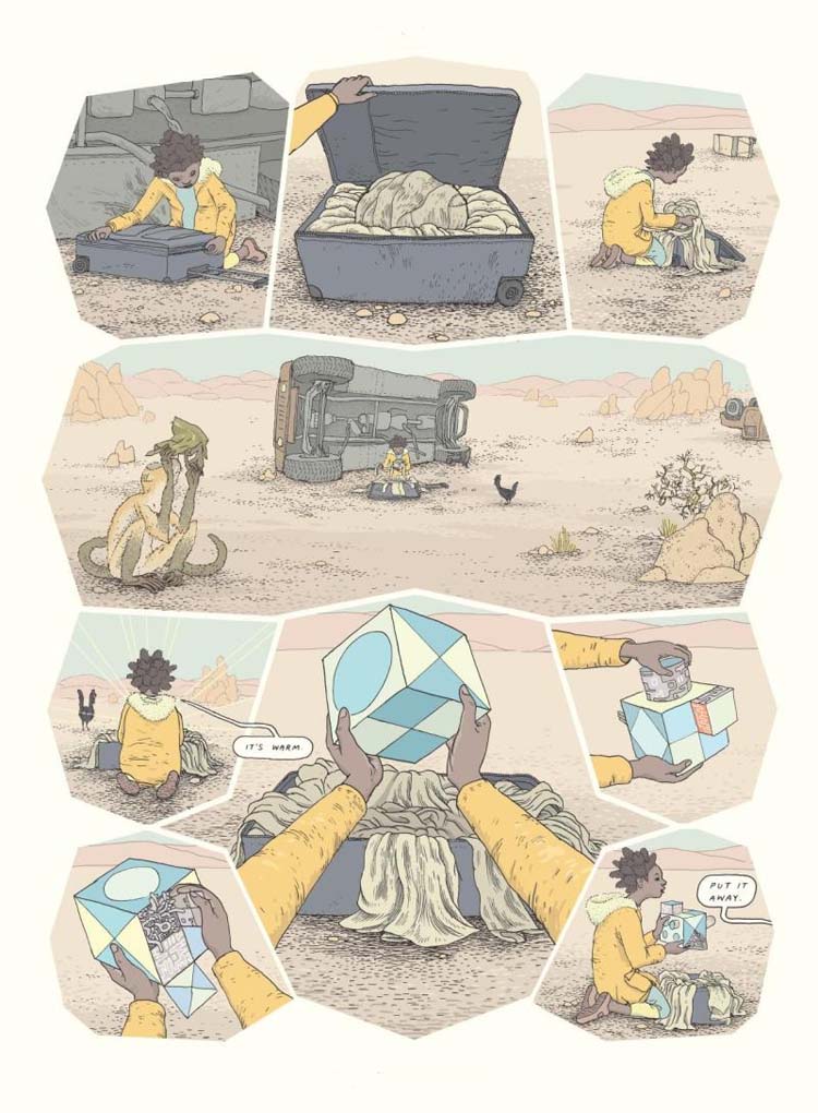 AN: Yeah, rectangles — they definitely have their place, but they are tedious to draw, which is to say, it’s not actually as straightforward as it seems to draw perfect rectangles with nice even little white gutters in between them all. For people who work that way, bless you, but I had to figure something else out. And along the way I discovered that the way panel borders are drawn can also have a lot of effect on the reader’s experience of the content of the story. My little experiment getting rid of them for Dogs and Water made that clear. So when I started Tongues I decided to make that a part of the project, exploring panel structure, and exploiting it in different ways. Of course not every page is precisely designed for a specific end, but in general the ‘normal’ pages in Tongues are intended to feel just a little like objects in and of themselves. maybe a bit like facets of a gem, or like planes in a folded or crumpled piece of paper. And that sense of folding or unfolding is meant to refer to the unfolding box that is at the heart of the story. So I guess it’s a small way to try and bring the reader into the story in a way, beyond just the traditional means of, like, good storytelling and pretty pictures.
