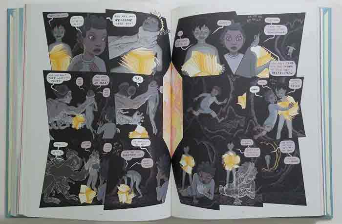 JP: Then there’s Tongues. The print version has a definite presence thanks to its page count and also its oversized dimensions. Aside from the book’s size are the front and back cover and spine designs and a couple other elements that I believe are exclusive to the print version. The sewn binding also allowed you as an artist to use the inside gutters of pages to your advantage. At the moment I’m looking at pages 222 and 223 and also 234 and 235. What considerations were on your mind when making these choices.
