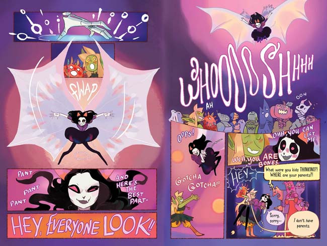 Aliza Layne returns to the ‘Allowstown world she created in her Beetle and the Hollowbones graphic novel which debuted in the summer of 2020. Open the book and you will find a world full of goblins and the undead and other fanciful people. Between its covers the book speaks of love and self respect and acceptance, all empowered by truth. At the heart of the story ready to transport both new and familiar readers are three best friends: the goblin girl Beetle, the undead Kat, and Penny the ghost who communicates in quite a curious manner. Not to be forgotten is Beetle’s wise Gran who is also the town’s beloved witch and protector.